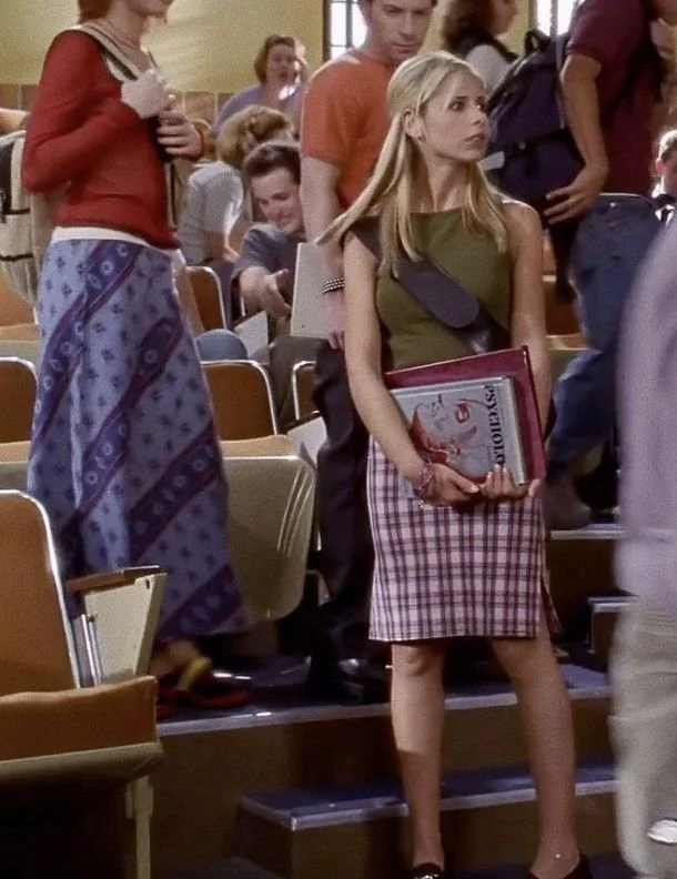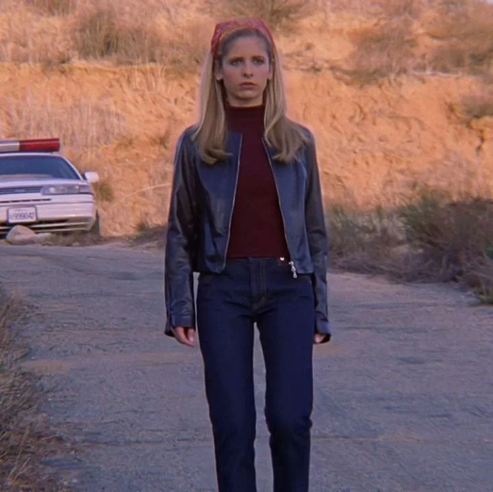 Bringing Buffy Summer’s look into 2024 (nearly 2025), means mixing edgy and girly with leather jackets, fitted midi skirts, and knee-high boots. Pair ribbed tank tops with pleated skirts or dark denim for casual yet cool vibe. Accessorize with dainty chokers or layered necklaces for a subtle, rebellious touch.