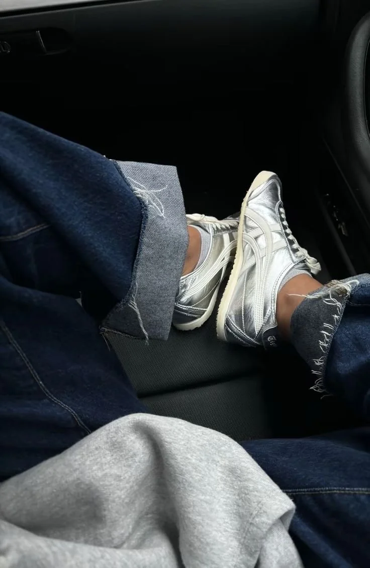 Silver is the dark horse contender of the bunch. Metallics still feel fresh, and a silver sneaker bridges the boundary between everyday sneaker and a big statement. They have enough shine to play with reflectivity against the city lights, but can still read softly when paired back with neutrals. Silver sneakers are almost your “now you see me, now you don’t” pair. Styling these babies doesn’t need to be daunting. Ground them with richer textures like corduroy, wool, or leather. Elevate them with a tonal outfit - think beige, charcoal, or cream. They work best as an accent, not a focal point, so keep the rest of your look quiet, and let the shine whisper.