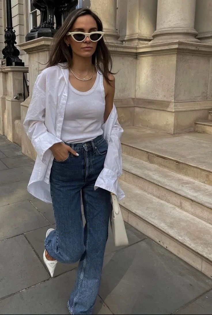 White on white doesn’t have to be intimidating. Starting small like with this look is one of the easiest ways to look instantly polished. Layer a crisp button-down over a tank, let the sleeves fall just right, and pair it with straight leg denim for balance. Slingback pumps and a structured shoulder bag make it feel intentional without feeling done. This one is the kind of outfit that quietly says, “I’ve got this.”