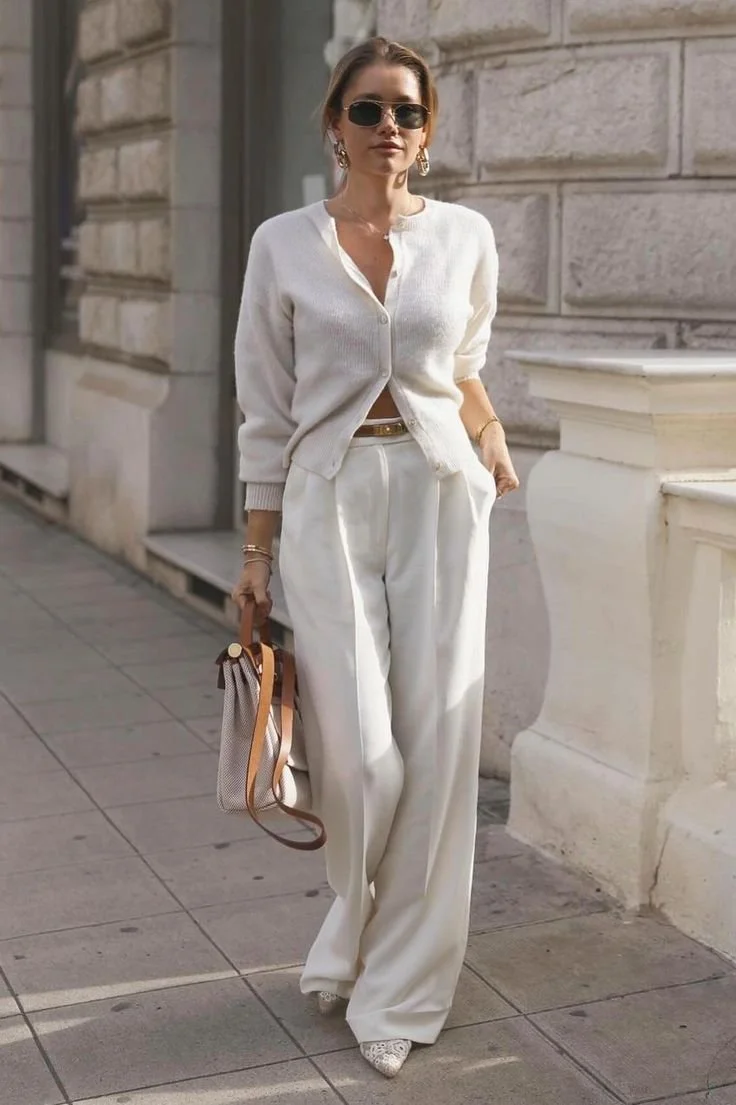 I never really understood the whole white being off-limits after Labor Day thing or why sometimes it only applied to shoes and other times it meant the entire wardrobe. The truth is, white is works year-round and it shifts with the season. I mean, hello, winter white, am I right? Instead of sundresses and sandals, think texture, structure, and a little edge. A crisp tee here, a sharp boot here. It’s about contrast and confidence. White has the ability to make even the simplest of outfits look well thought out and polished. Whether you lean minimal, romantic, or just plain cool, these are a few (mostly) all-white looks I’ve bookmarked lately for outfit inspiration.