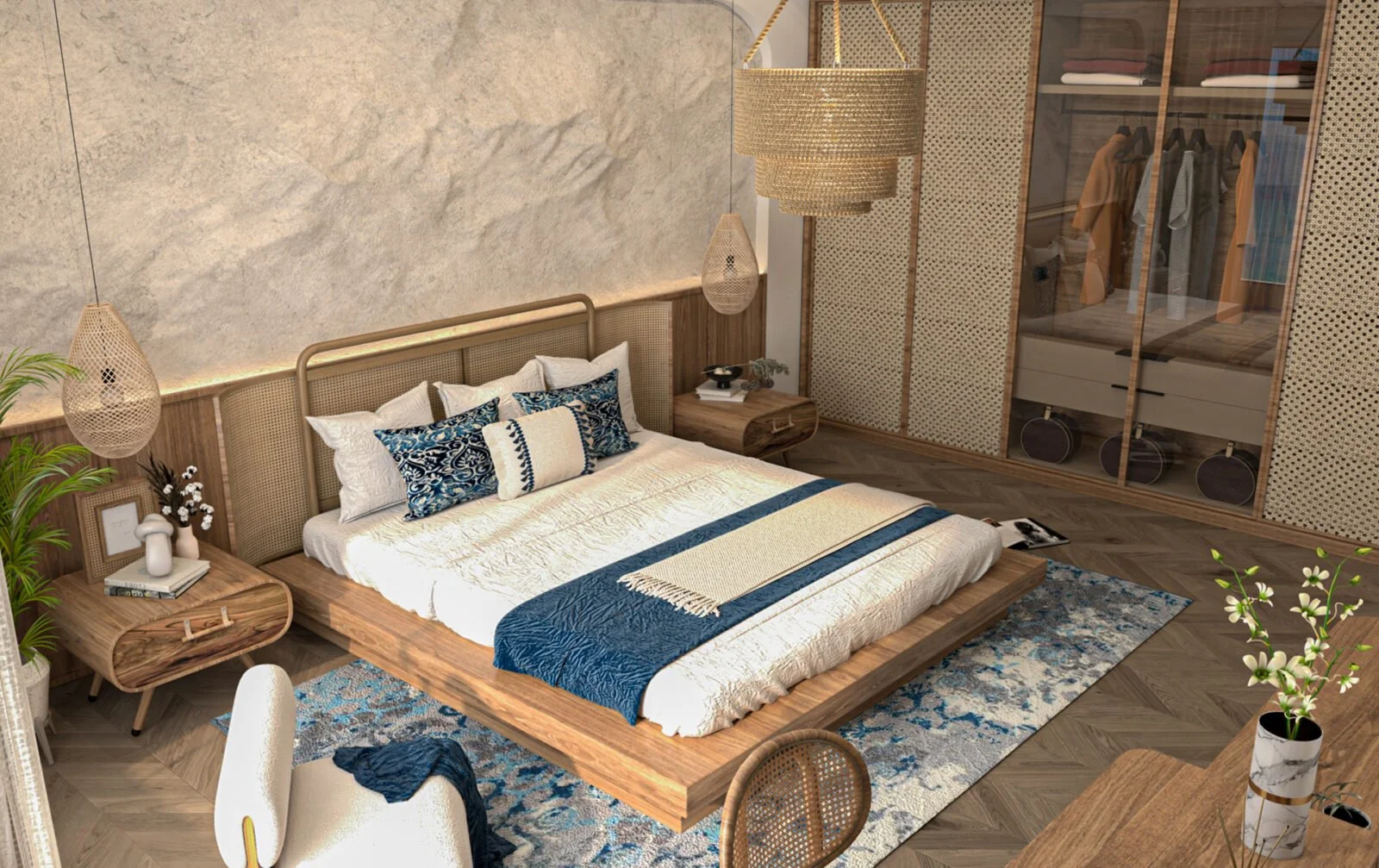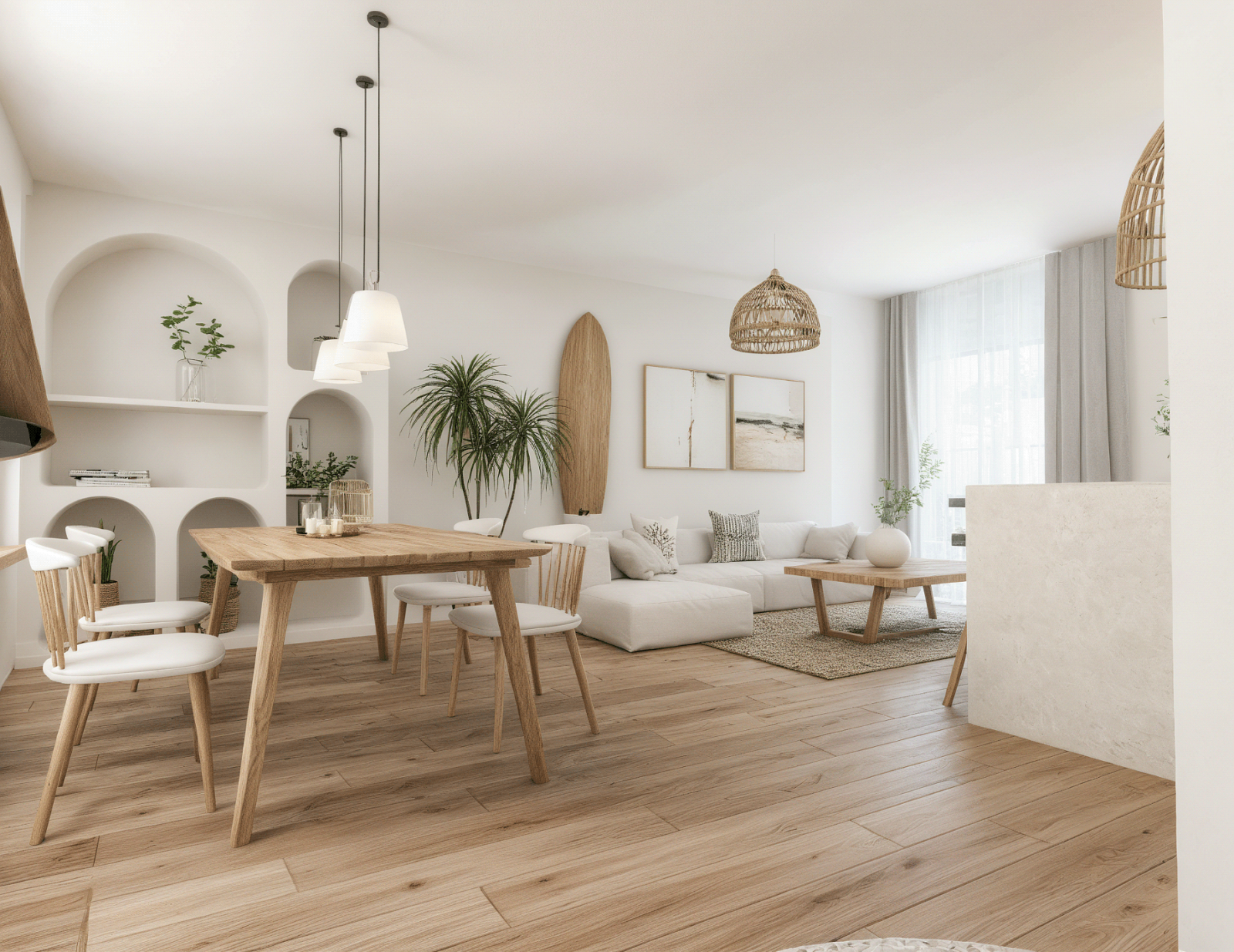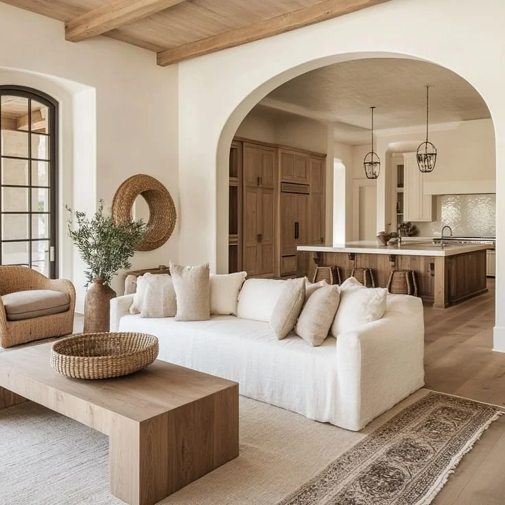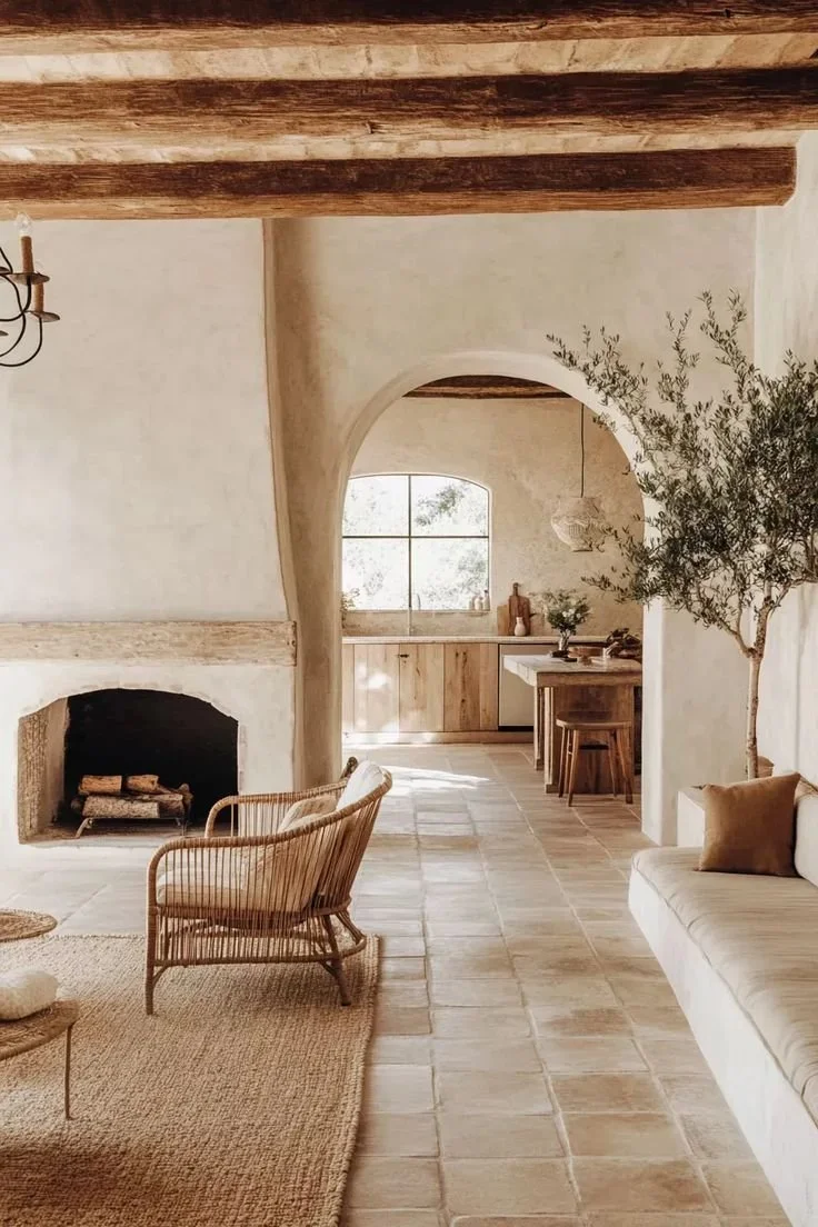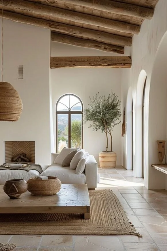 Start with a neutral palette: Soft whites, sandy beiges, and creamy tones form the perfect canvas. Layer in terracotta, olive green, or muted blue for contrast.