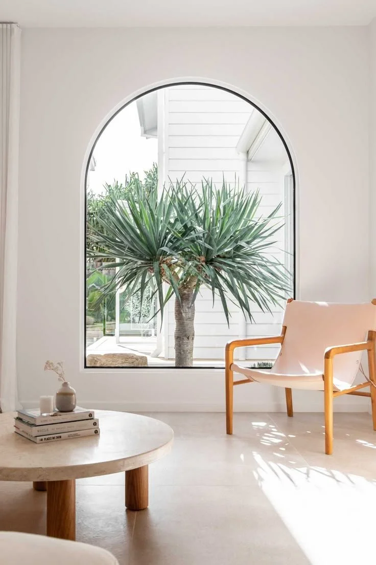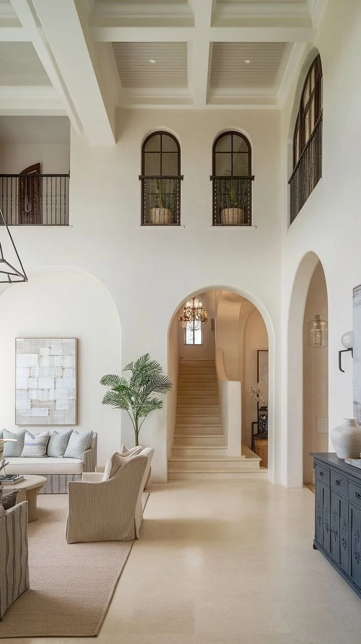 Add curves and arches: Arched doorways, rounded mirrors, and curved furniture silhouettes help soften spaces and reference traditional architecture.