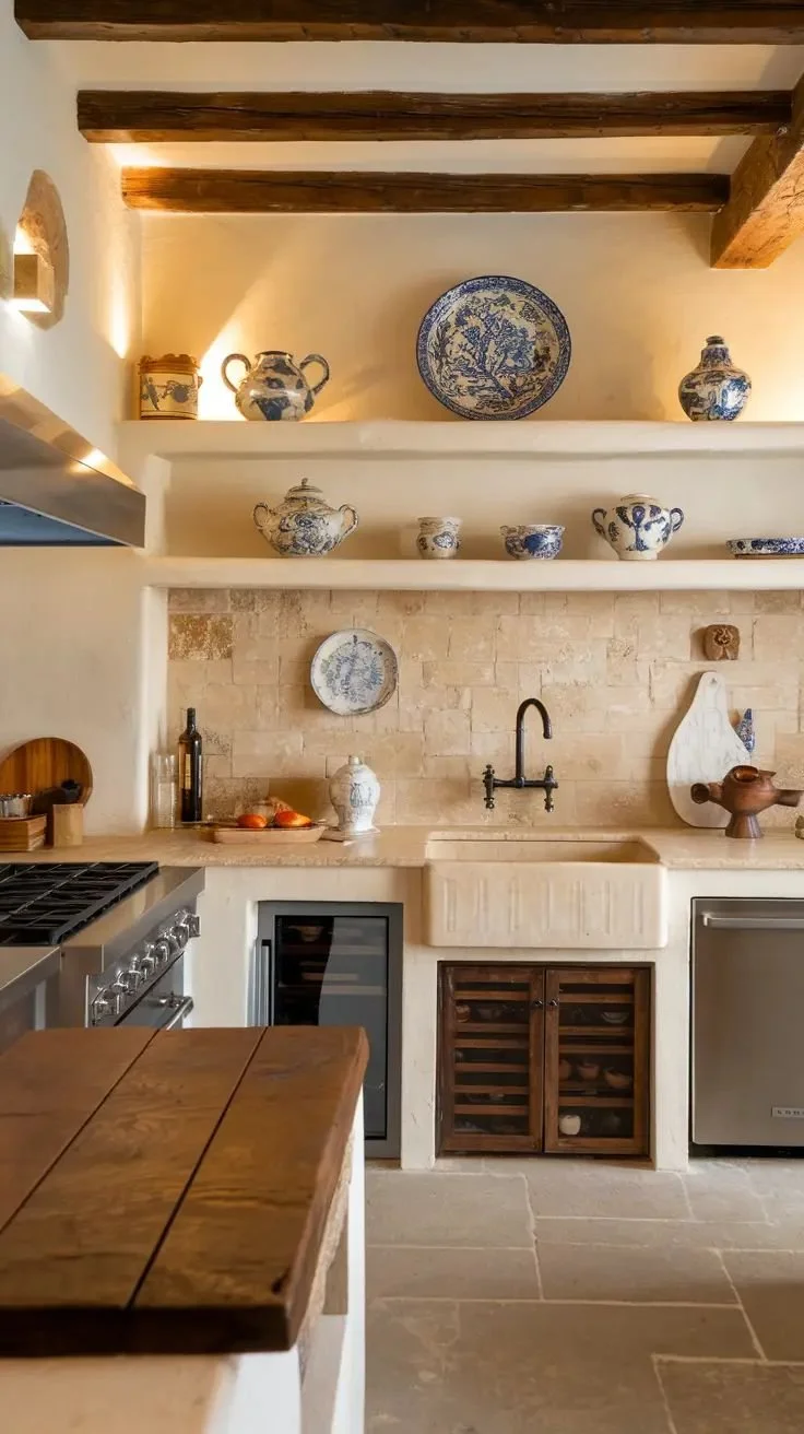 Mix old with new: Vintage pottery, aged wood pieces, or reclaimed tiles pair beautifully with streamlined furniture and modern lighting.