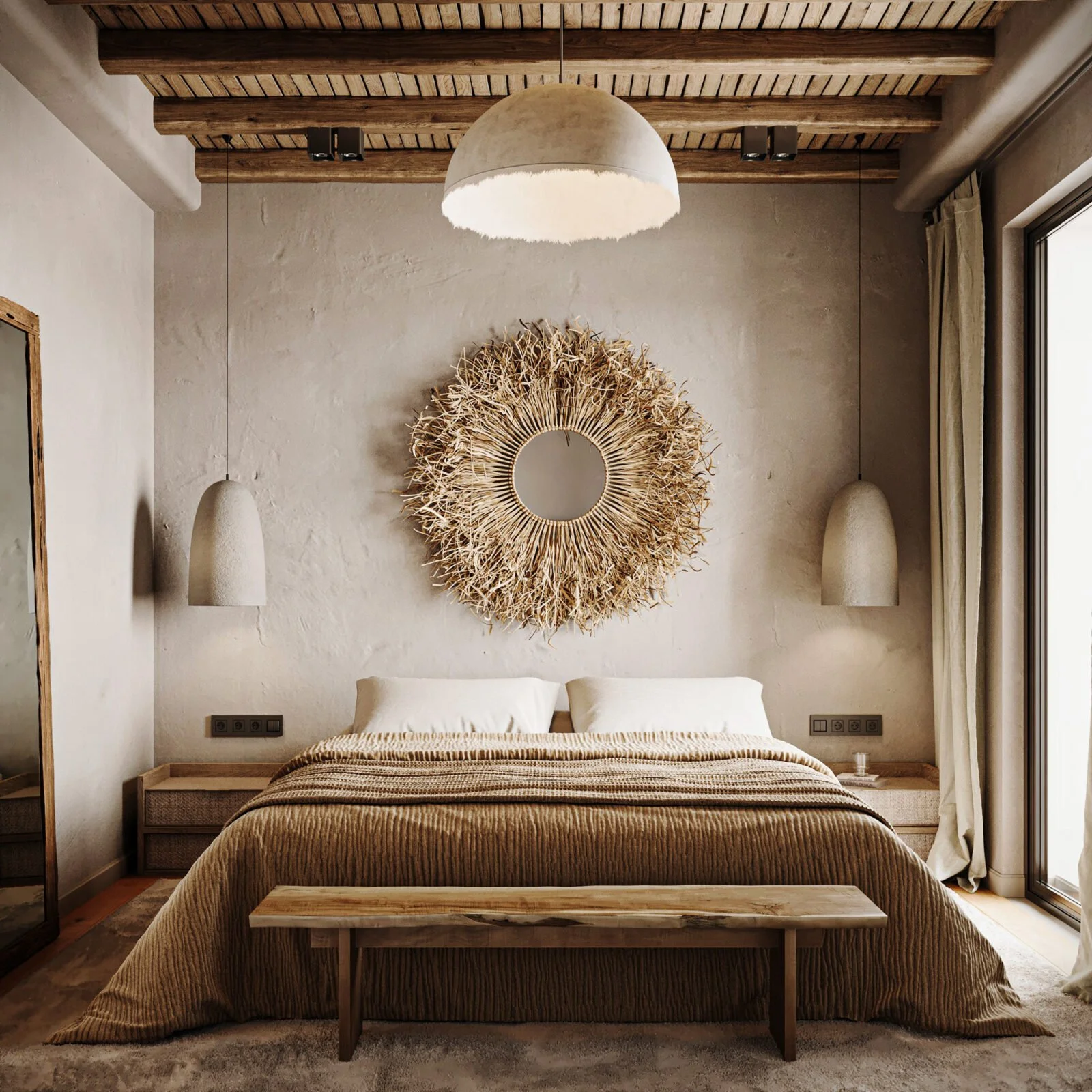 Texture-rich - Plastered walls, rustic wood beams, hand-painted tiles, woven textiles, and iron accents.