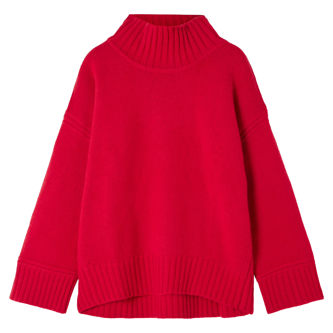 Warmth, texture, and color. Everything about this look is instant drama and coziness. The red mock neck sweater adds a bold, confident pop while the high-rise jeans keep the look grounded and wearable. The knee-high socks and wedge pumps give it a slightly retro, fashion-forward feel. Topped off with the iconic Ingrid bag, this outfit is elevated and perfect for colder days that demand standing out.