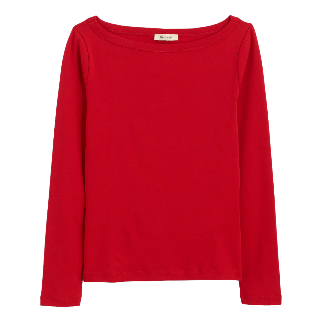 Sometimes all an outfit needs is one thing that shifts the whole vibe, and in this outfit, itās the red boatneck top. Against a dark-wash stovepipe jeans, itās a combination that is effortlessly chic rather than aggressively trendy. Red is having a serious renaissance right now, and this is exactly how to wear it without it wearing you. The accessories here are doing careful, confident work: a gold choker adds warmth, the oval sunglasses bring a vintage-inspired softness, and the scrappy sandals keep the proportions right and grounded. The real MVP of the look is the sleek black envelope clutch. It brings up the sophistication that takes the look from cute to actually stylish. This is the outfit for a dinner youāre excited about, a gallery opening, or a Saturday afternoon you want to look good for.