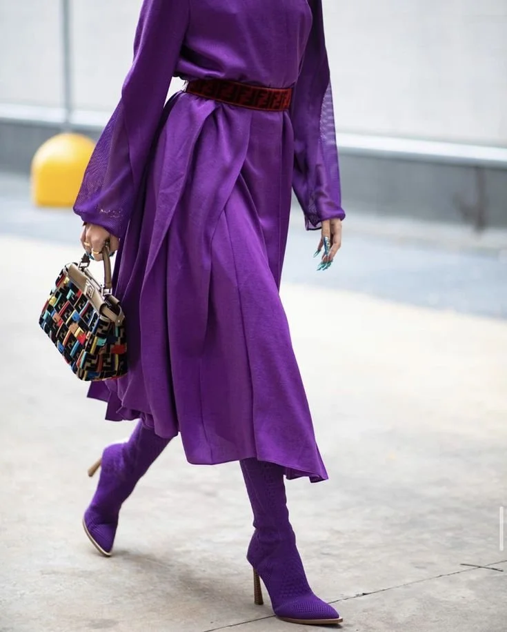 This one feels like a no-brainer. If committing to a full purple garment feels like a lot, start with your feet. A purple shoe - a satin mule, a pointed pump, a suede sneaker - is one of those moves that reads extremely fashion-forward with almost zero risk. You’re not rethinking your whole outfit; you’re just giving it a better ending. Carry a purple bag instead of a black one, and the same principle applies. One well-chosen accent piece in this shade does way more work than you think.